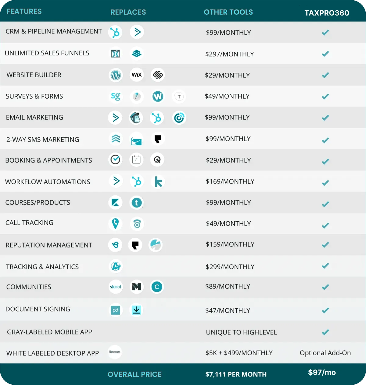 Get the all the marketing tools you need in one place, automate your sales pipeline, integrate your favorite tools, keep track of your business and more...